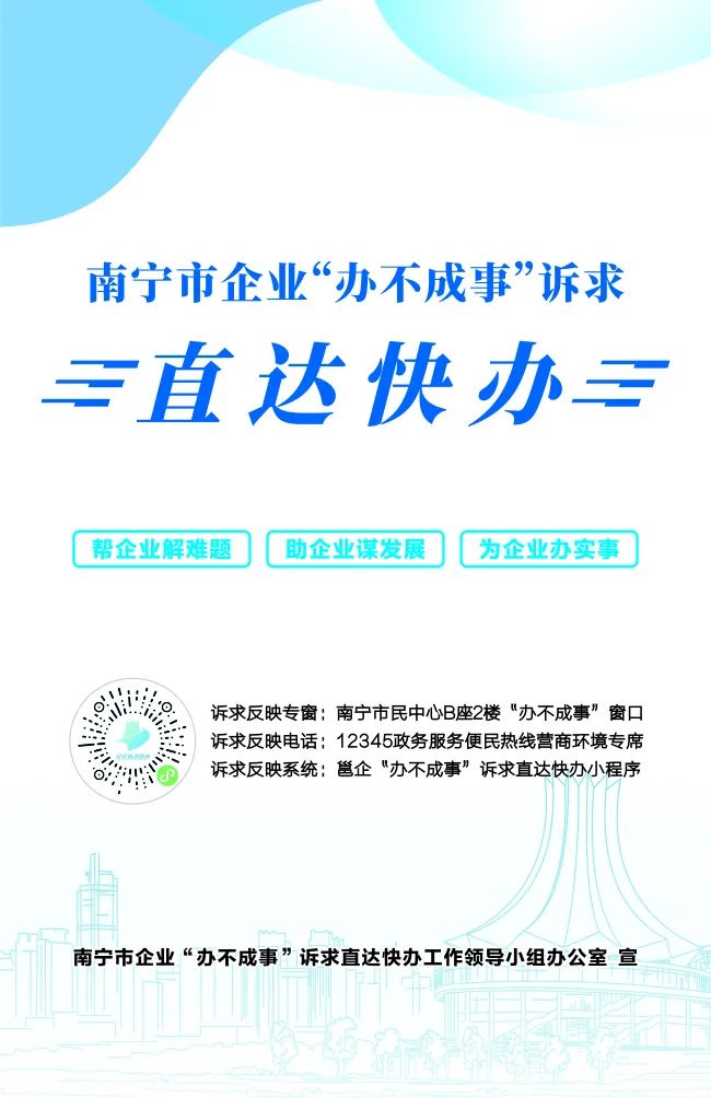 為貫徹落實中央、自治區(qū)經(jīng)濟(jì)工作會議精神,優(yōu)化首府營商環(huán)境,南寧市建立企業(yè)“辦不成事”訴求直達(dá)快辦工作機制,依托南寧市民中心“辦不成事”訴求窗口、12345優(yōu)化營商環(huán)境專線、“邕企辦不成事訴求快辦”小程序收集企業(yè)訴求,暢通訴求反映渠道,整合紀(jì)檢監(jiān)察監(jiān)督、行政監(jiān)督、司法監(jiān)督力量推動責(zé)任落實,構(gòu)建訴求受理、快速響應(yīng)、高效辦理、答復(fù)反饋、跟蹤督辦、改進(jìn)提升的全過程閉環(huán)管理體系,幫助企業(yè)破除“辦不成事”的難點、堵點、痛點、瘀點,及時解決企業(yè)經(jīng)營發(fā)展難題、積極回應(yīng)關(guān)心關(guān)切、幫助企業(yè)提振信心,切實為企業(yè)解難題、辦實事,為建設(shè)面向東盟開放合作的國際化大都市開好局起好步提供有力支撐。